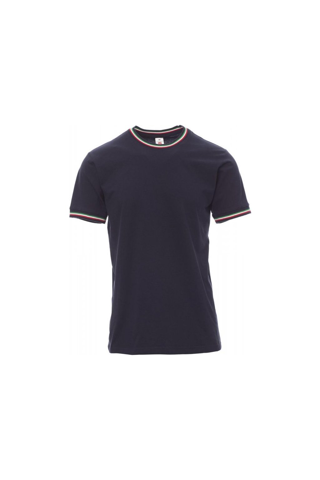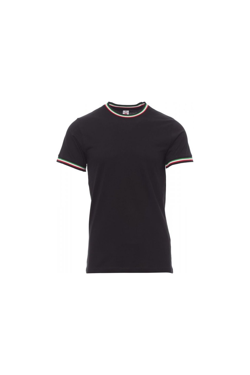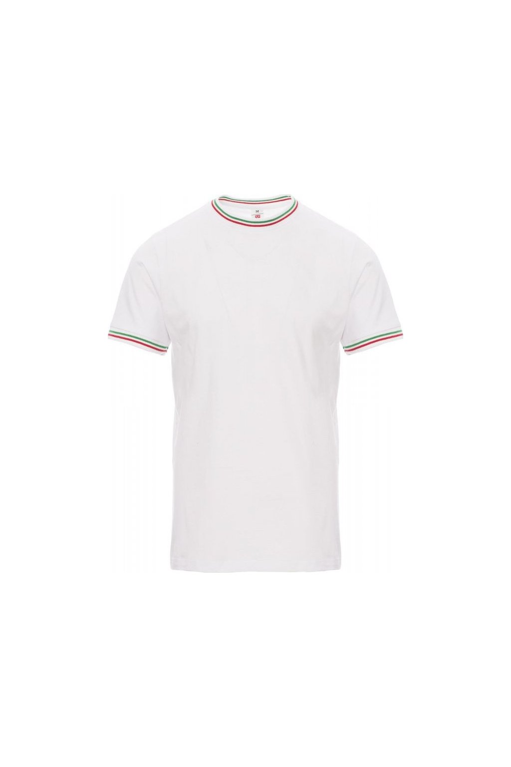 Pánské tričko s krátkým rukávem a kulatým výstřihem, límeček a lem rukávu s kontrastní italskou trikolórou, 2,3 cm pružný žebrovaný lem ze směsi spandex u krku s vrchním prošíváním na přední straně, vyztužovací páska od ramene k rameni viditelná na límečku, pružné švy, postranní sešití.