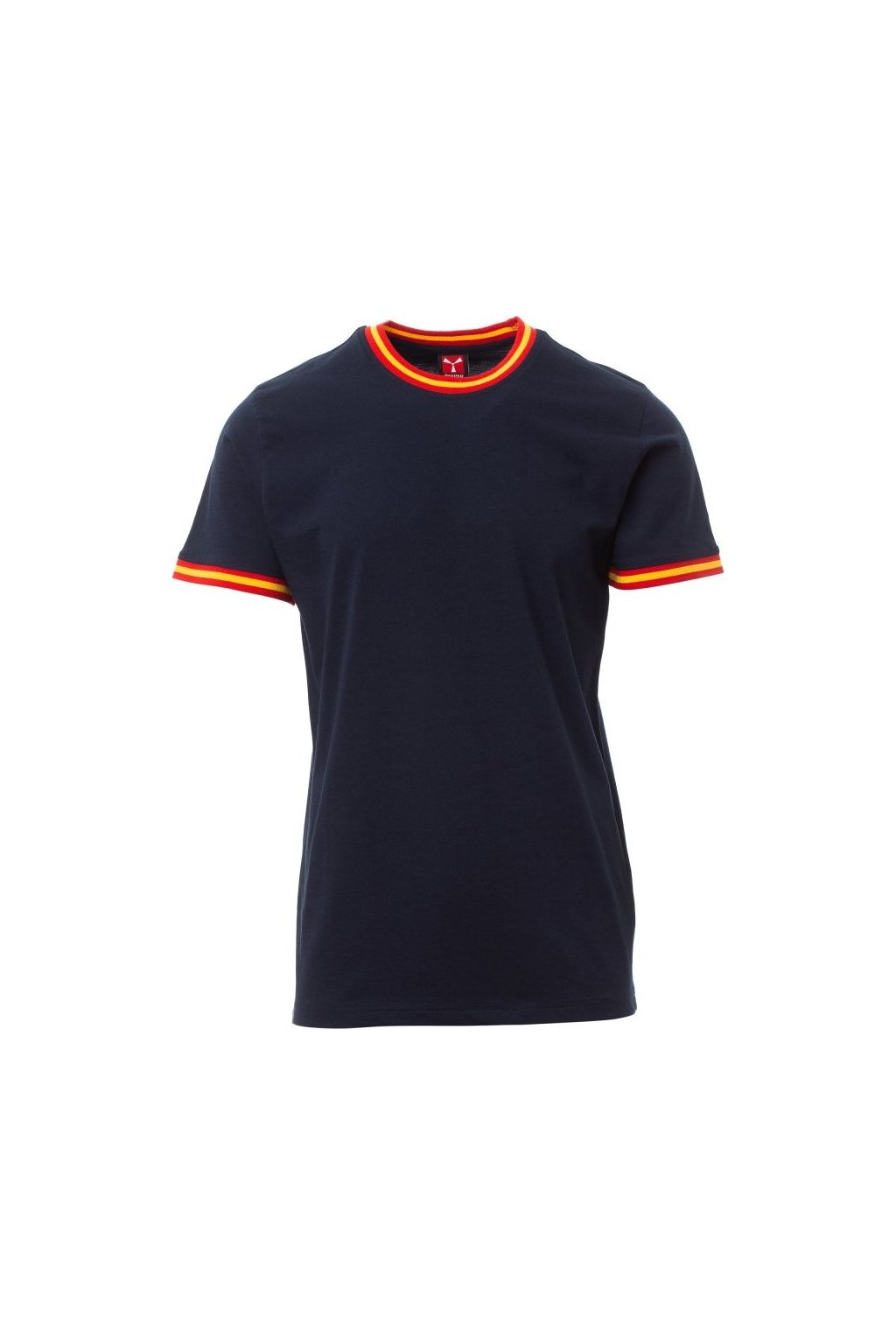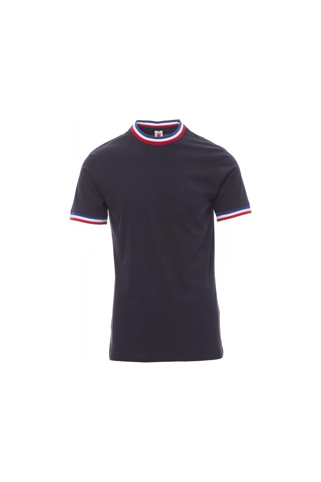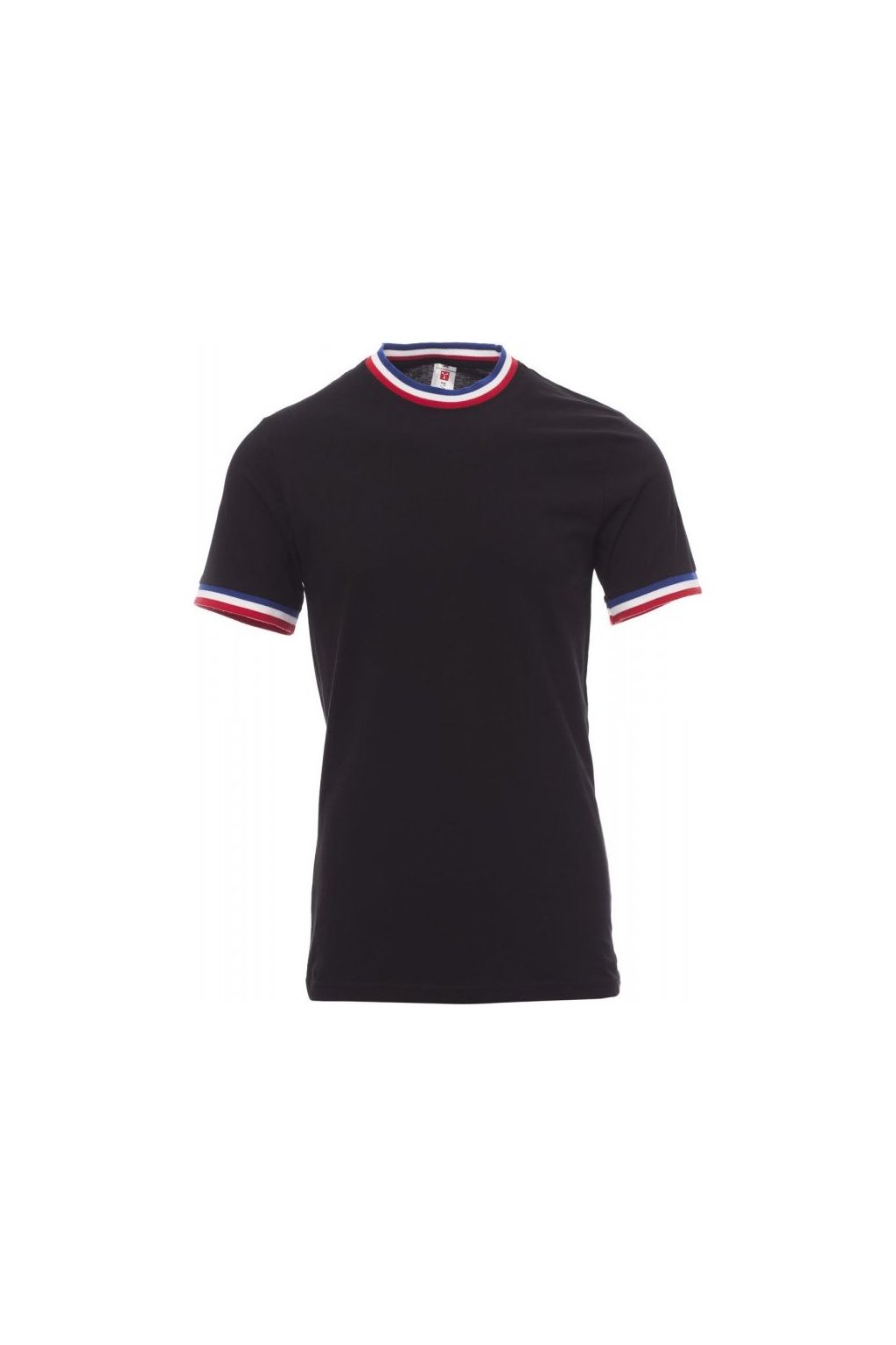 Pánské tričko s krátkým rukávem a kulatým výstřihem, límeček a lem rukávu s kontrastní italskou trikolórou, 2,3 cm pružný žebrovaný lem ze směsi spandex u krku s vrchním prošíváním na přední straně, vyztužovací páska od ramene k rameni viditelná na límečku, pružné švy, postranní sešití.