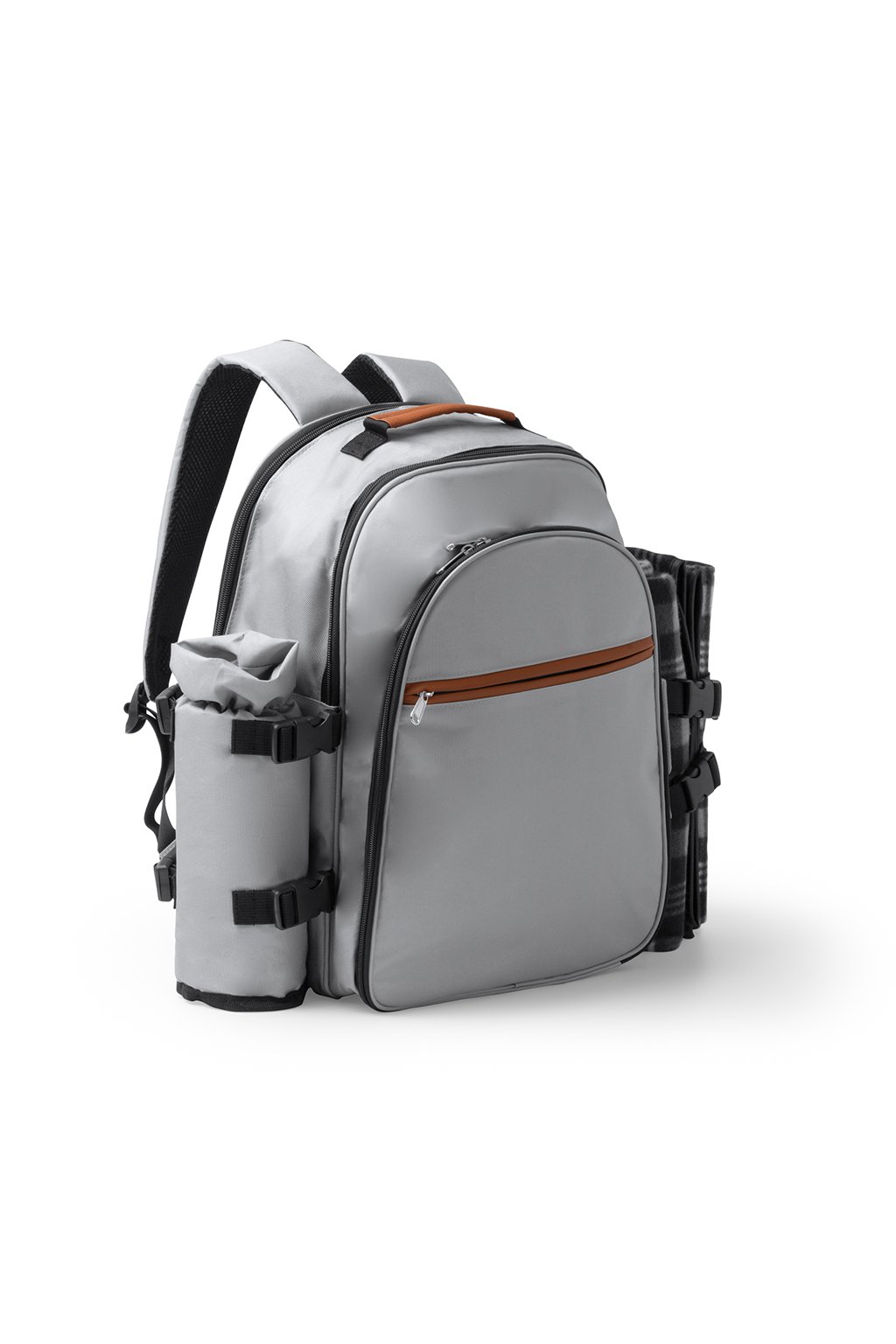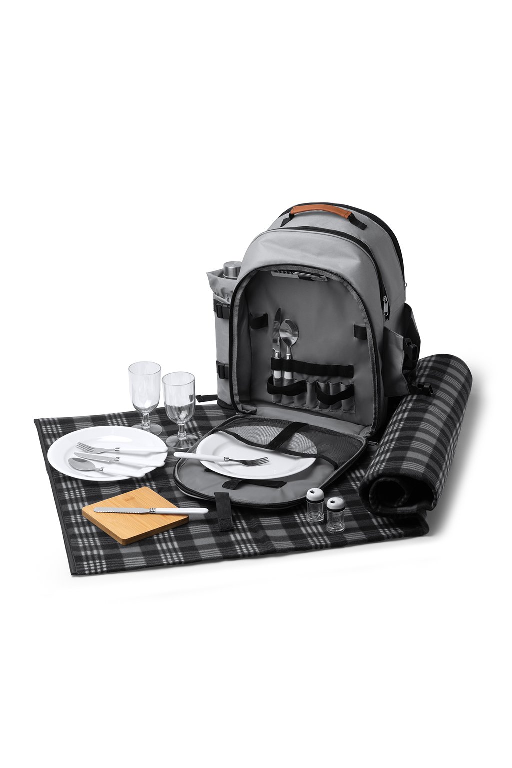 Piknikový batoh z RPET polyesteru. Hlavní přihrádka obsahuje: 2 hrnky, 2 talíře, 2 sady příborů. Jedna boční přihrádka na piknikovou deku (je součástí balení) a jedna boční přihrádka na láhev.
