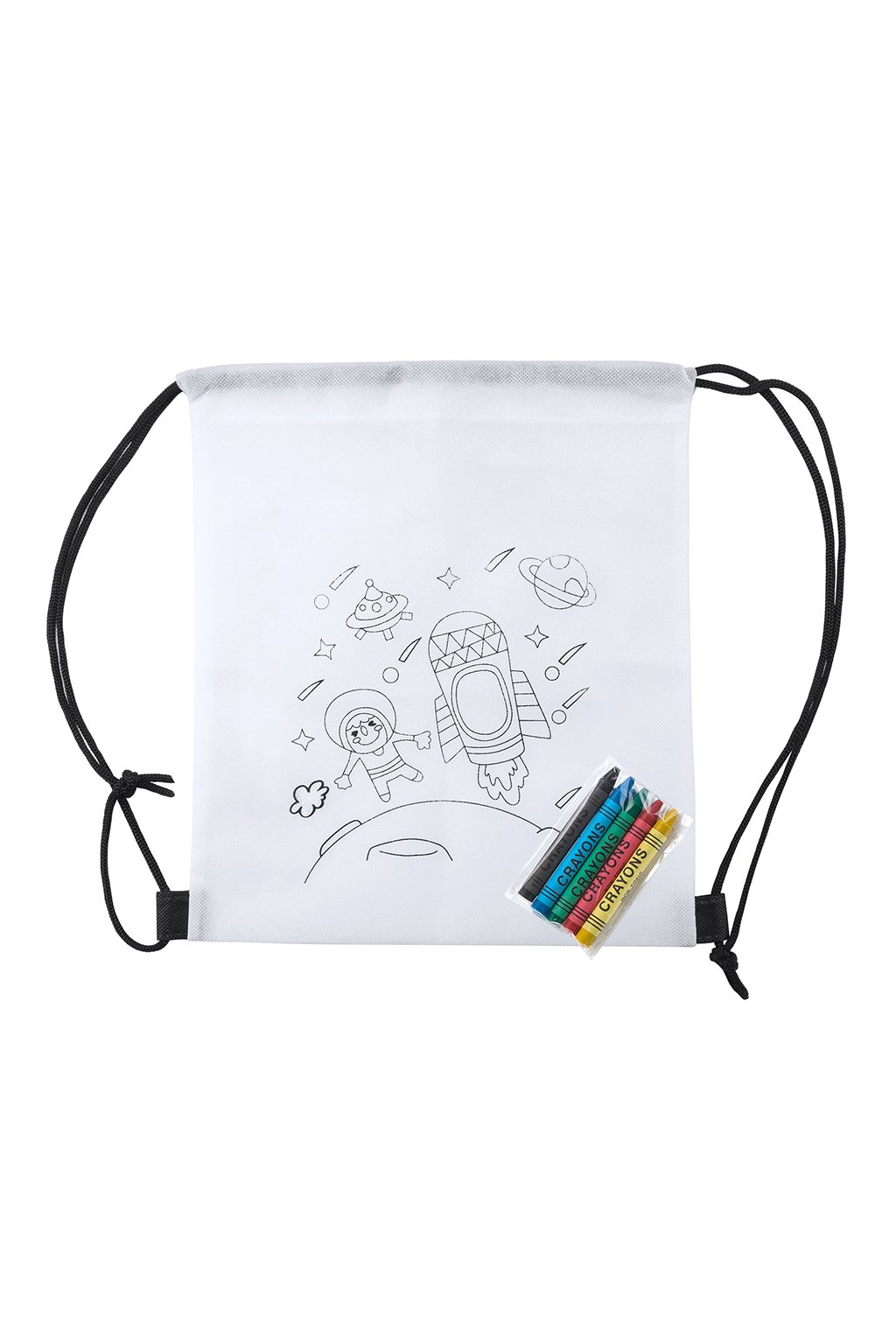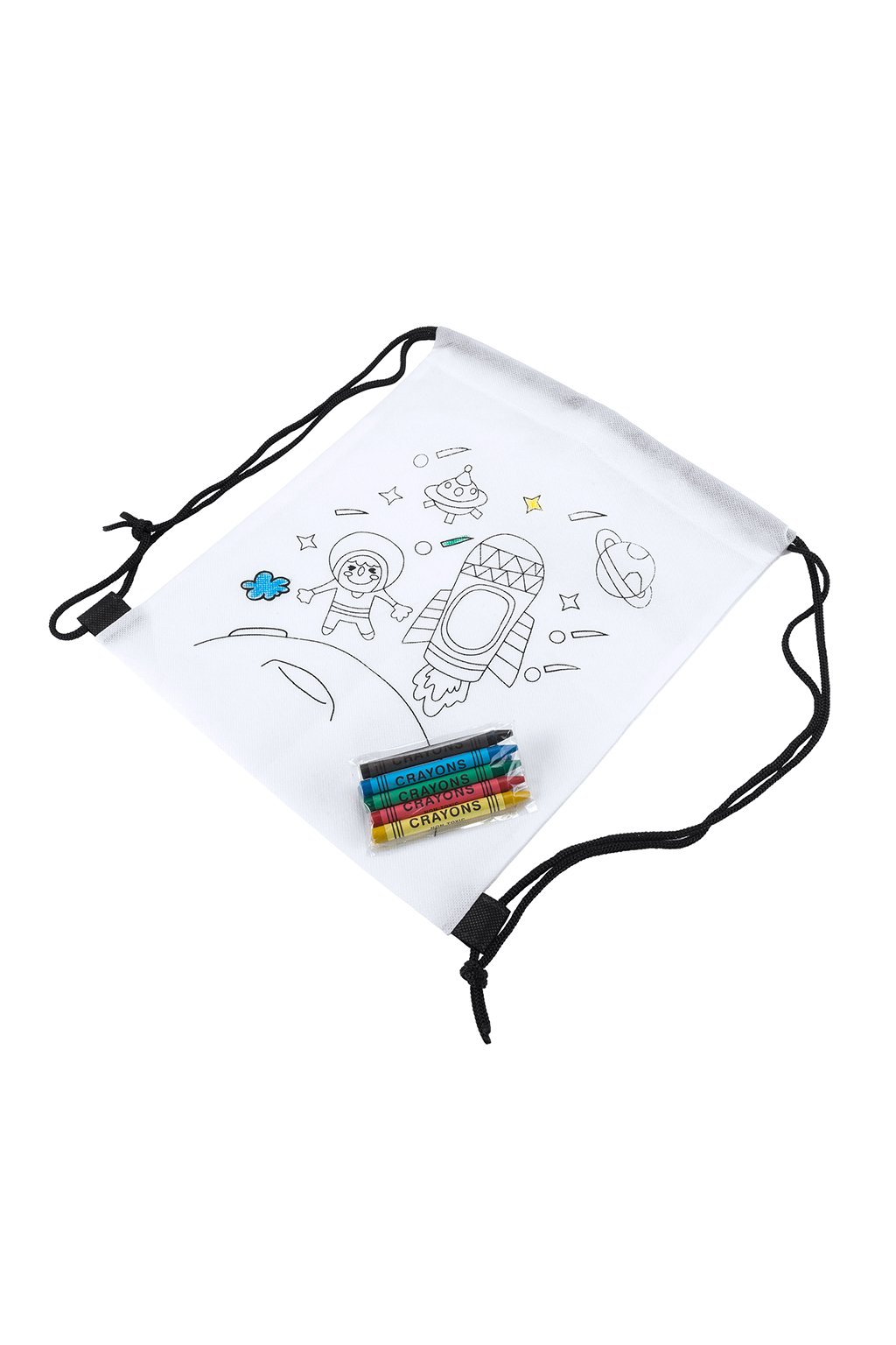 Netkaný stahovací batůžek s designem na vybarvování. Součástí balení je 5 pastelek v různých barvách.