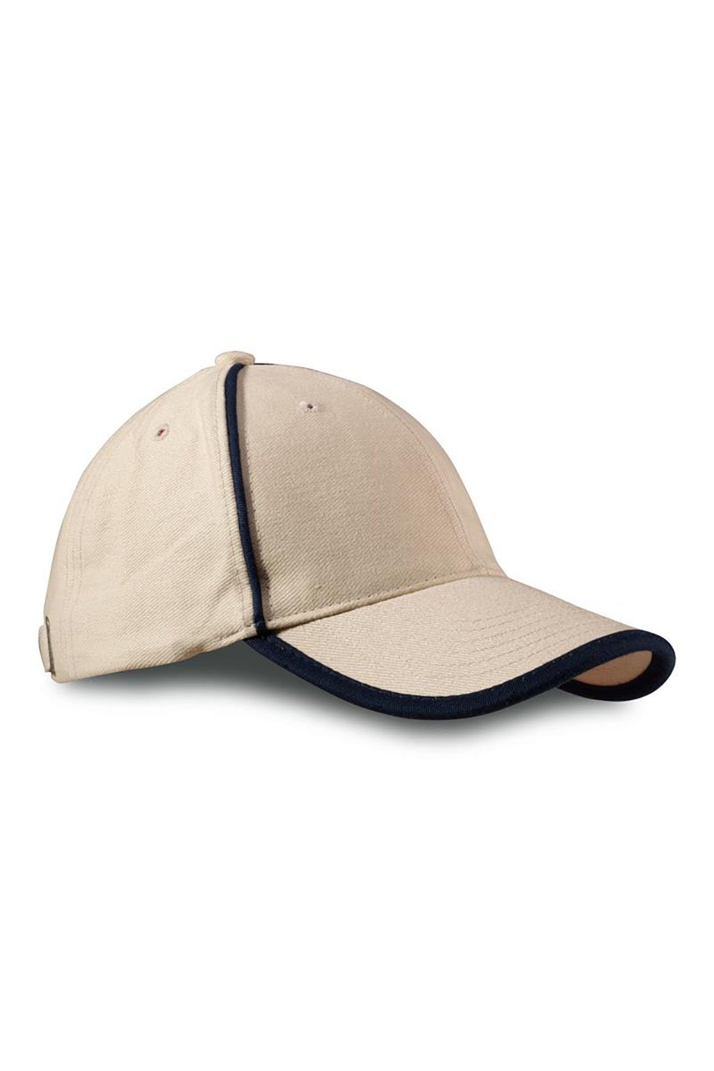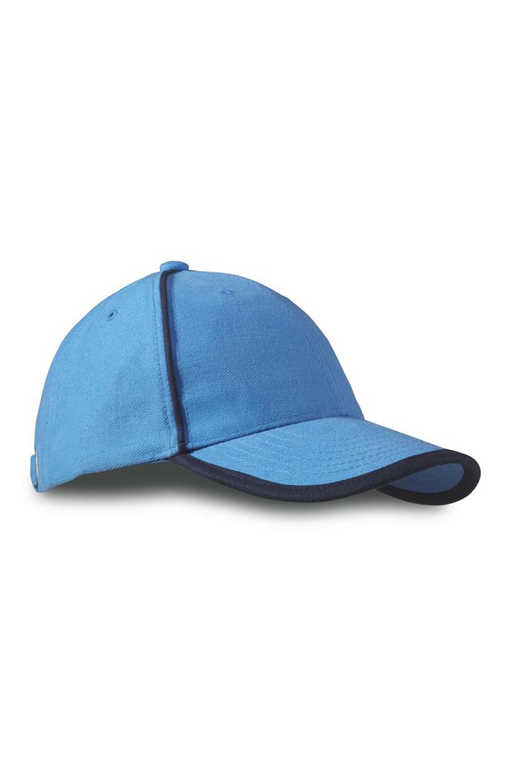 Šesti panelová čepice se zapínáním na kovovou sponu. Kontrastní švy na kšiltu a panelech.