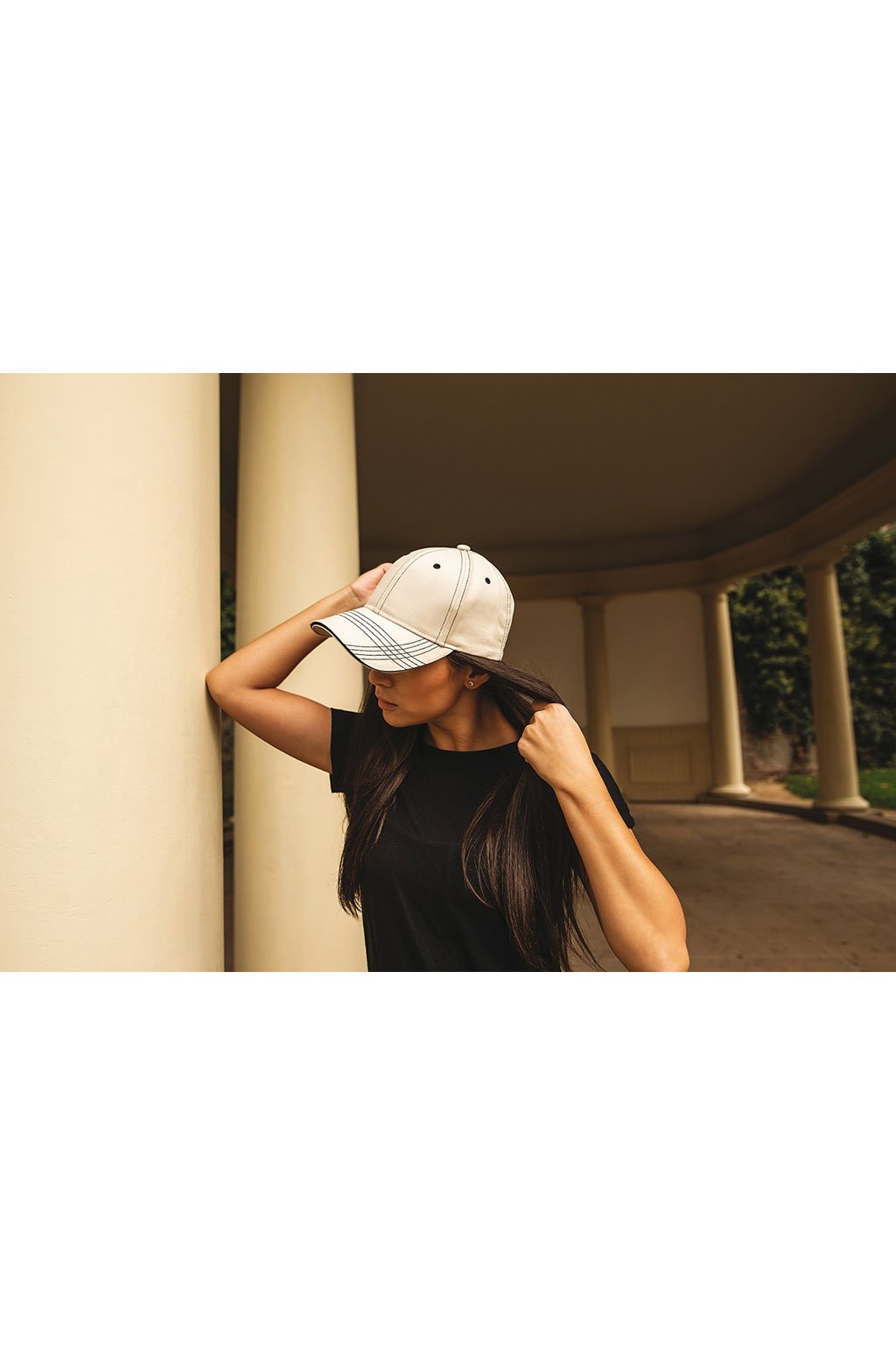 Šestipanelová čepice se zapínáním na kovovou sponu. V kšiltu je všitý proužek v doplňkové barvě. Kontrastní prošití a větrací otvory, bavlněný potící pásek a vnitřním lemem.