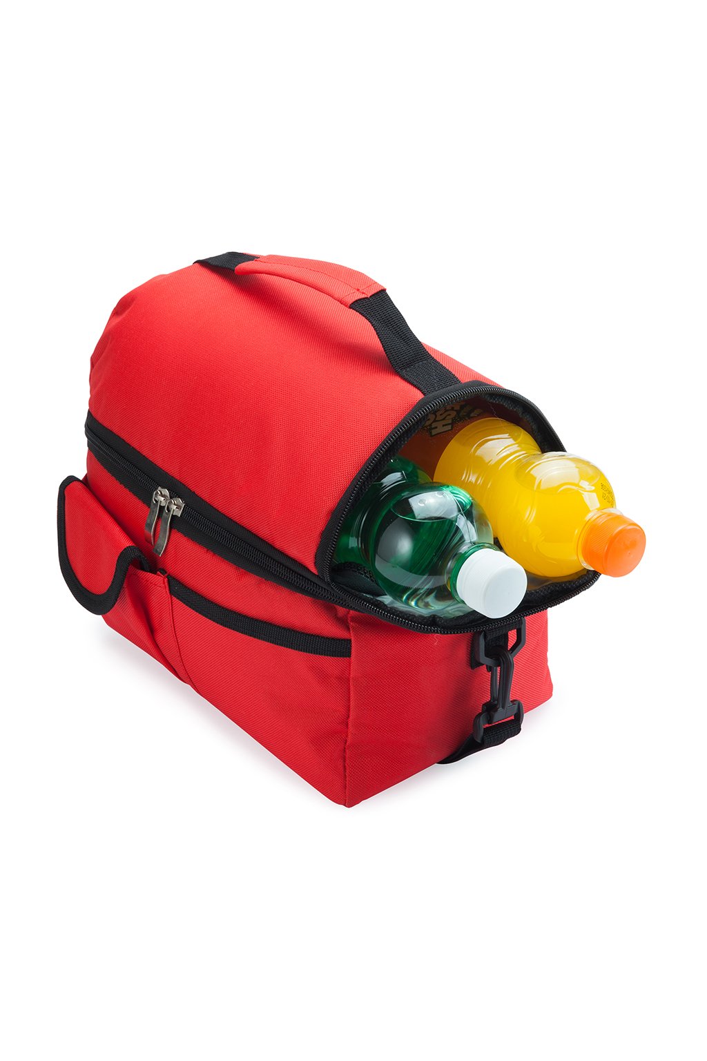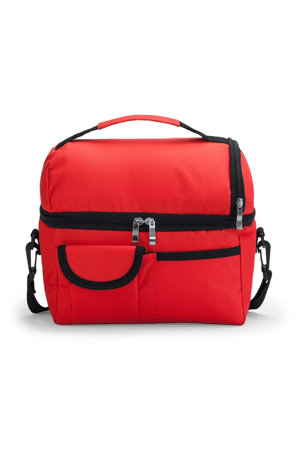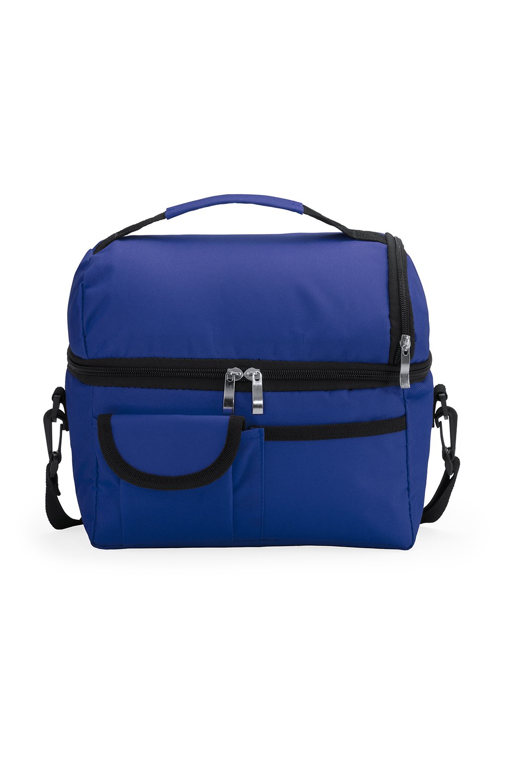 Víceúčelová chladicí taška z polyesteru 600D. Izotermické vnitřní přihrádky a praktické vnější kapsy. Nastavitelný a polstrovaný ramenní popruh s karabinou.