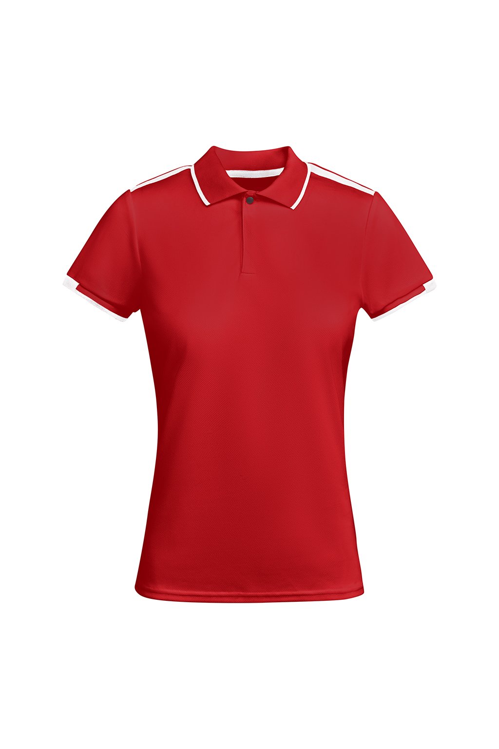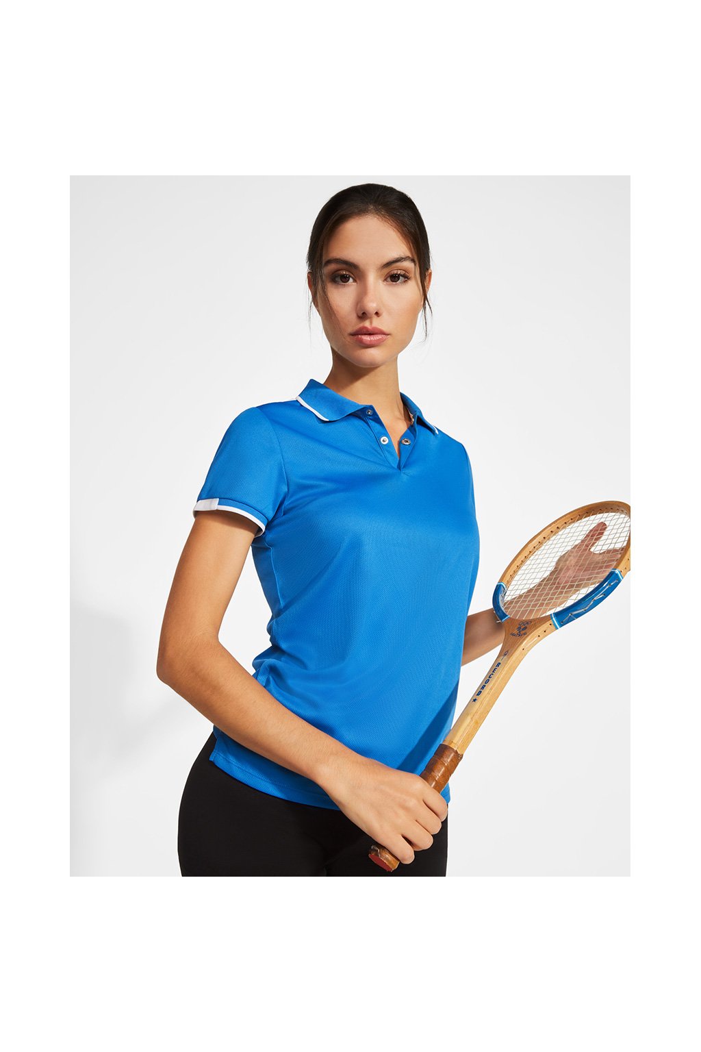 Dámská sportovní polokošile s krátkým rukávem z antibakteriálního recyklovaného polyesteru. Polokošile má 1x1 žebrovaný límec a detail v kontrastní barvě v lemech rukávů a na ramenou. Zesílené kryté švy v límci. Zapínání na dva zapínací knoflíky a skrytý spodní knoflík. Boční rozparky na spodním lemu.