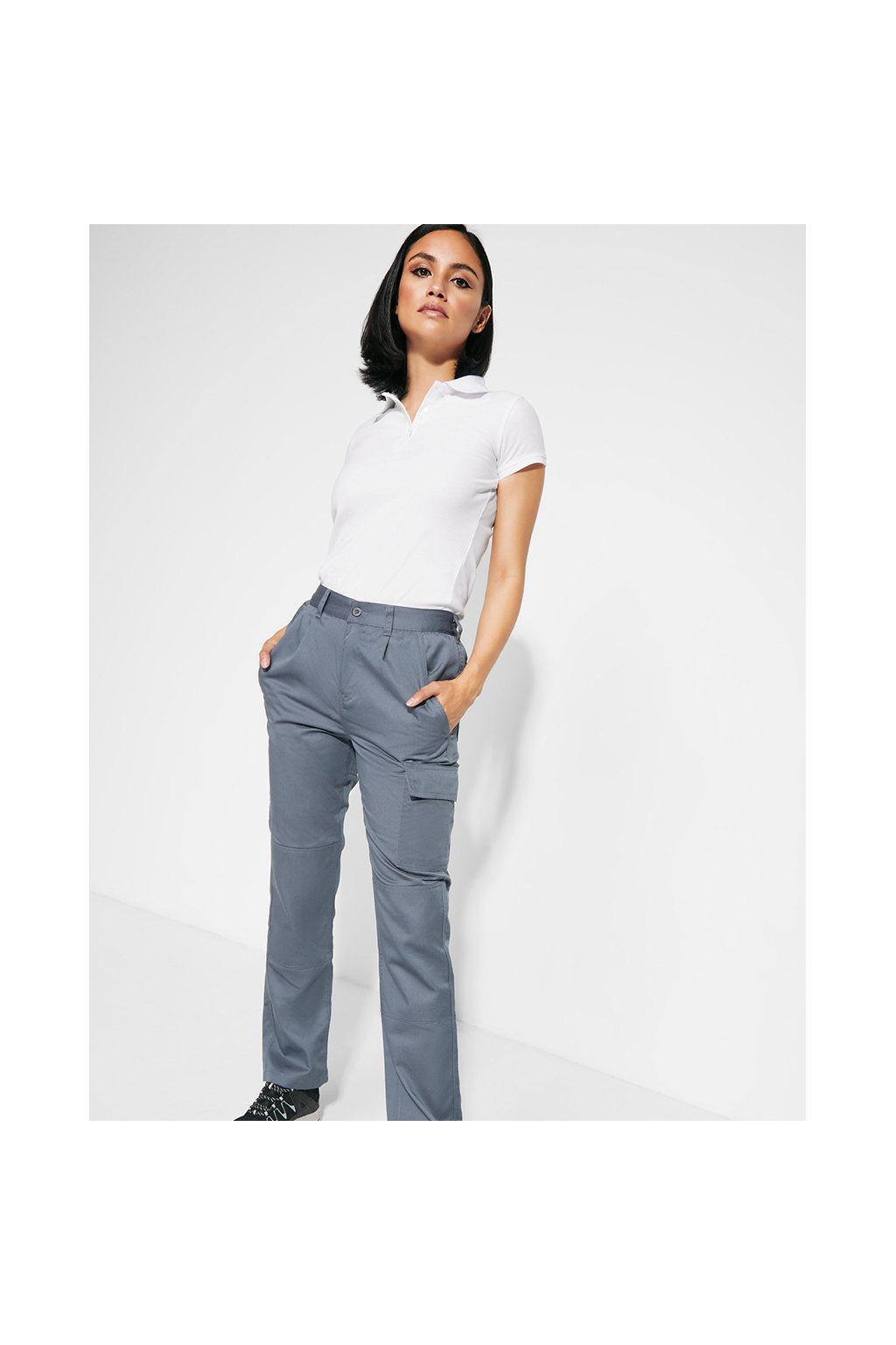 Dámské pracovní kalhoty se dvěma předními kapsami. Upravitelný obvod pasu. Zesílená dvojitá zadní část. Dvě zadní funkční kapsy, jedna postranní. Pas s poutky na opasek.