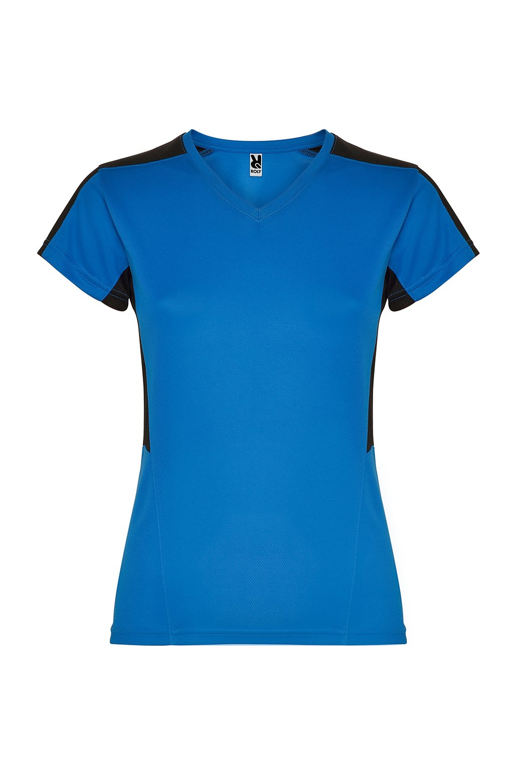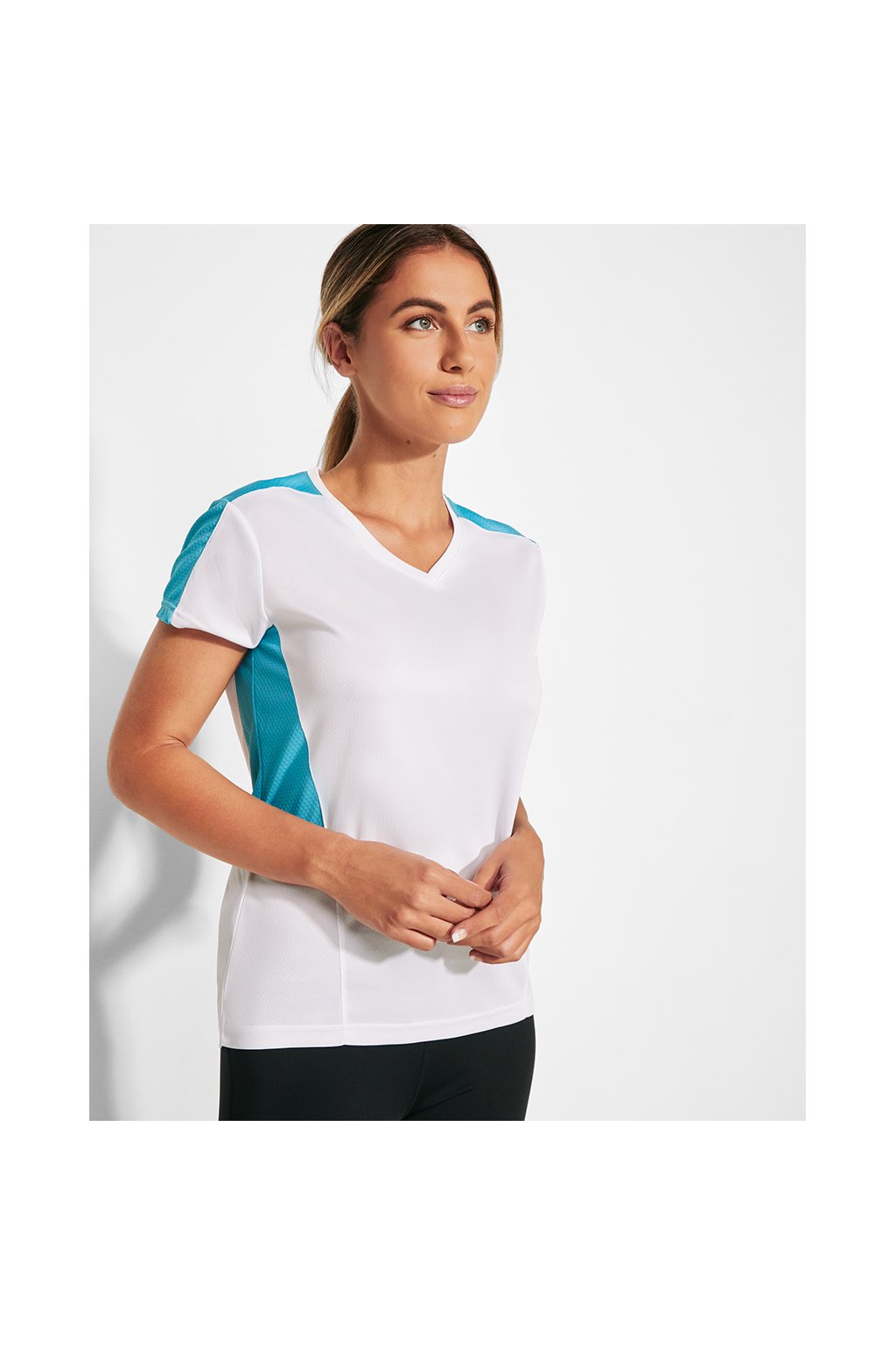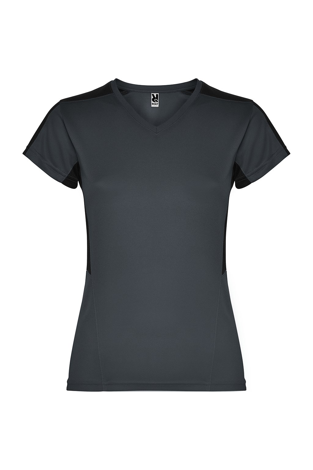 Dámské funkční triko s krátkým rukávem a výstřihem do V. Kombinace dvou polyesterových tkanin. Hlavní materiál polyester honeycomb a polyester 3D mřížky na ramenou a bočních vsadkách. Materiál dobře absorbuje vlhkost.