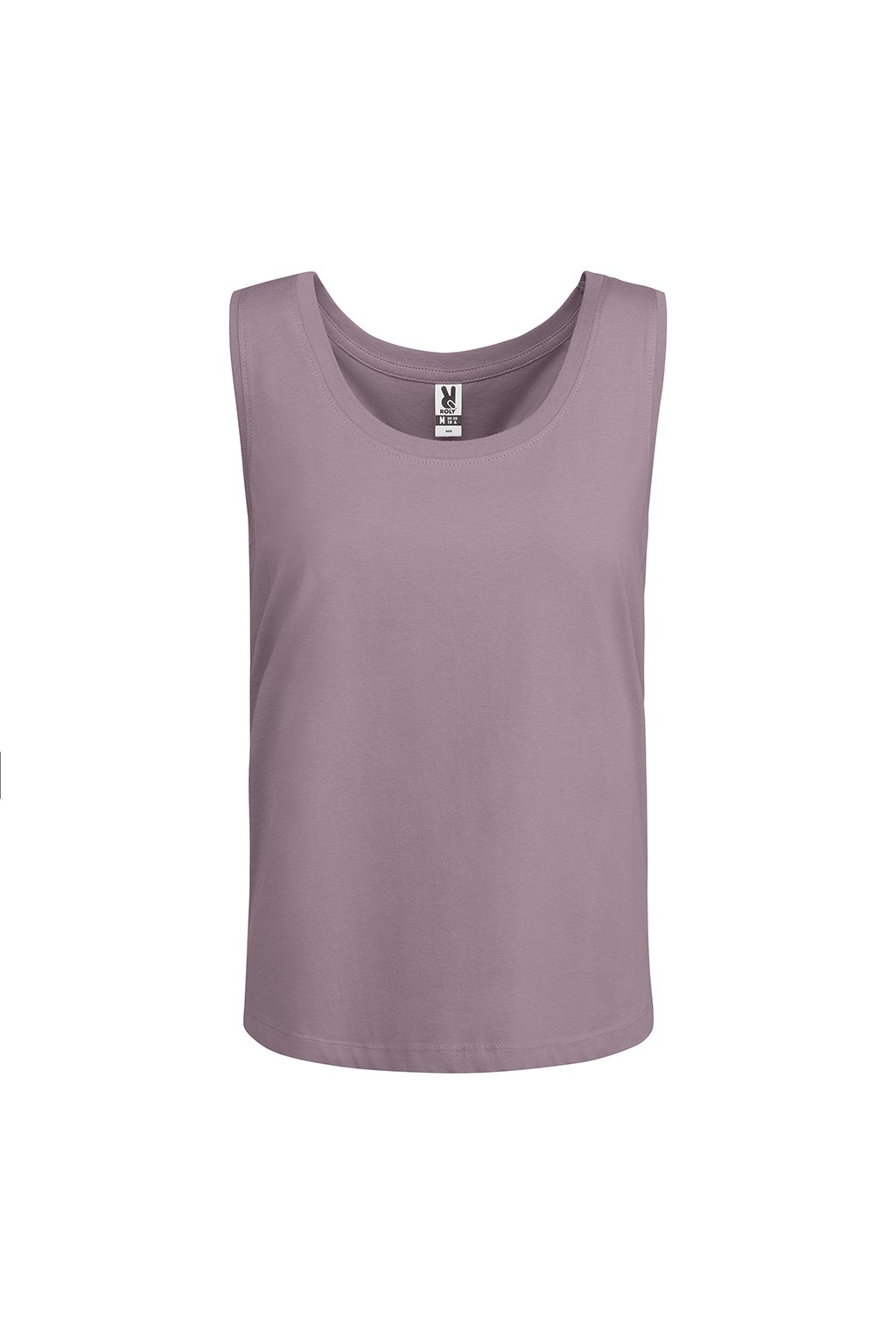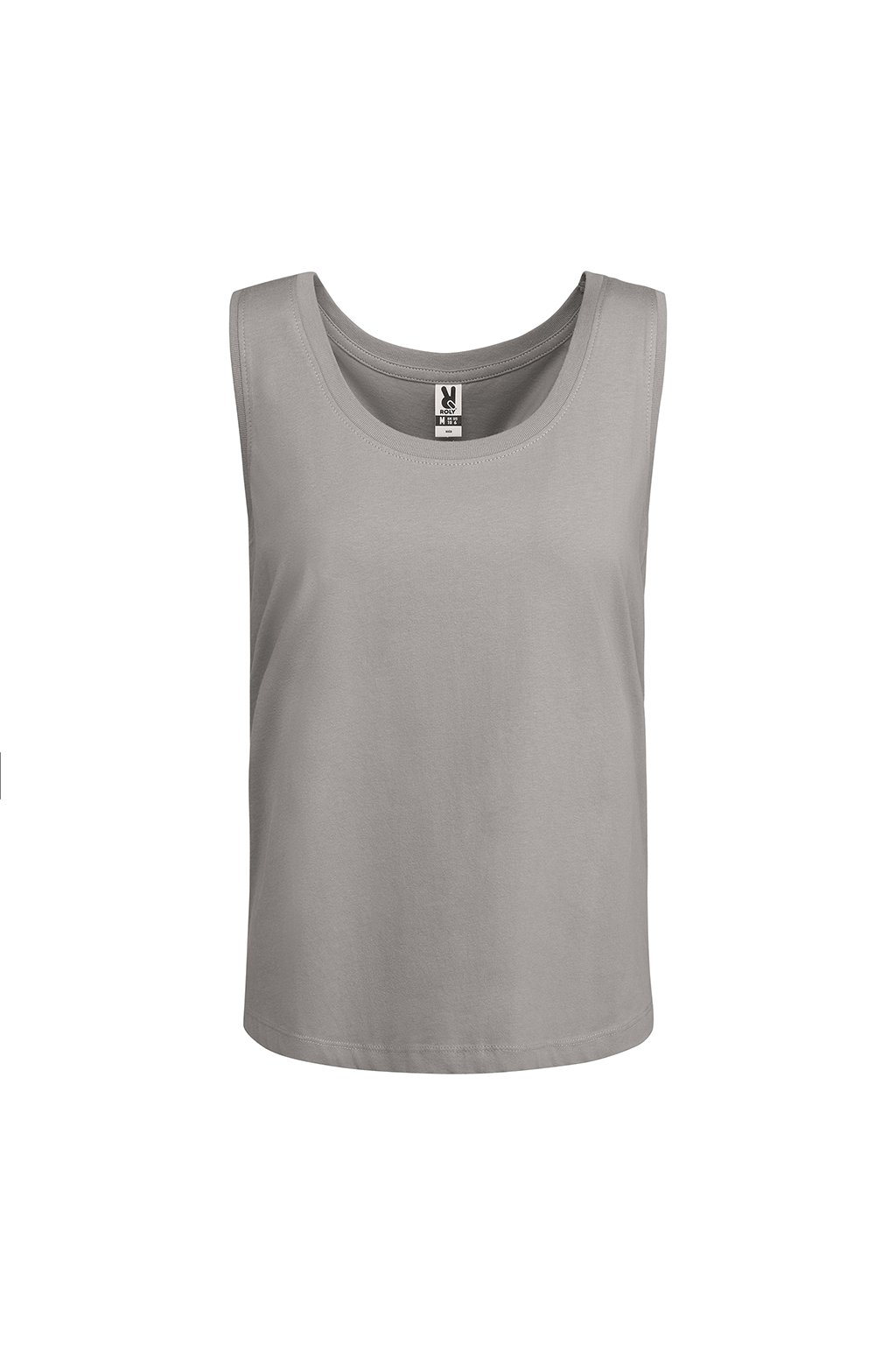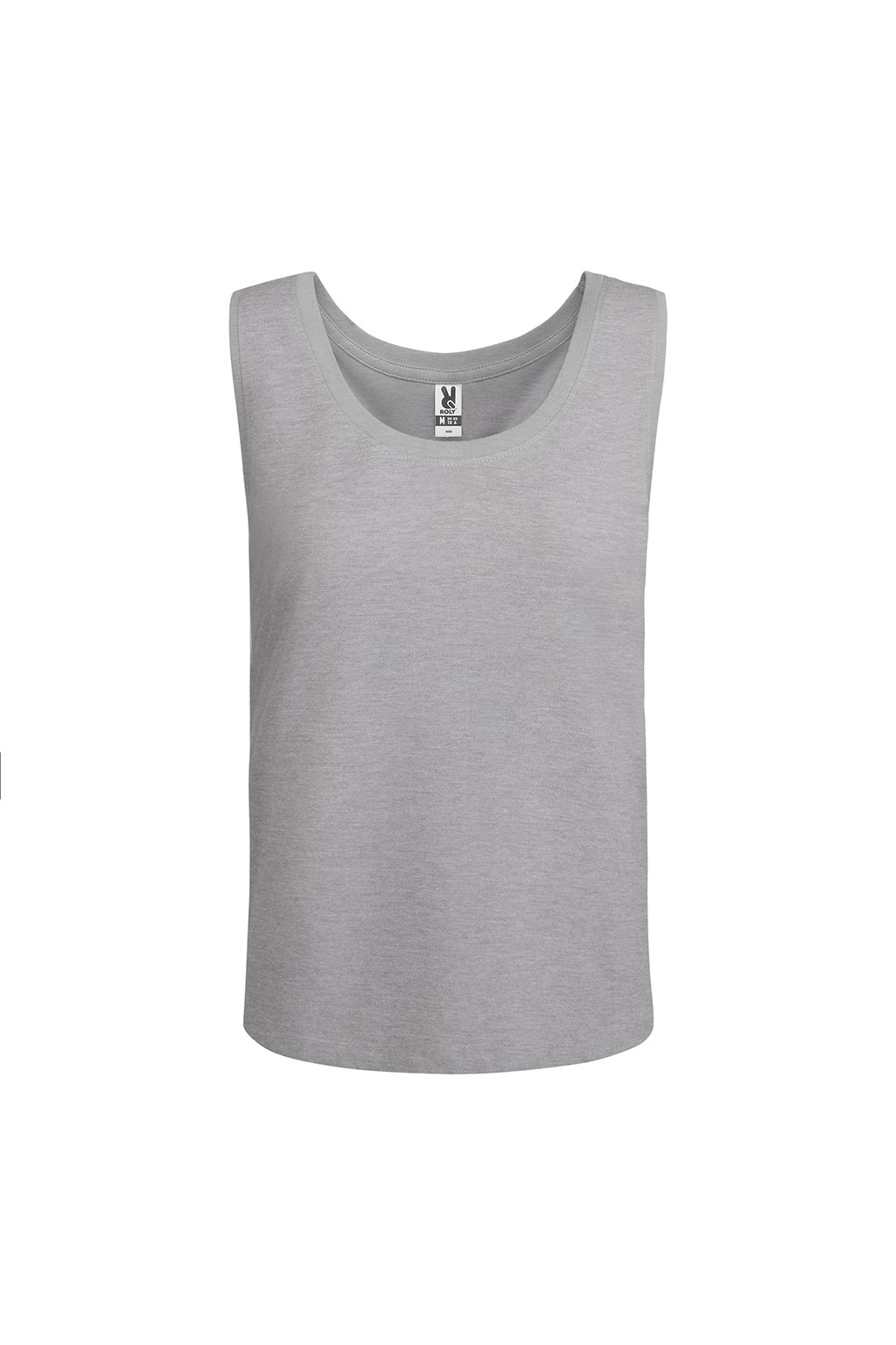 Volné dámské tílko se širokými ramínky. 1x1 žebrovaný výstřih a průramky. Oblý tvar spodního lemu. Boční švy. Barva 58 (melange) - složení 85% bavlna/15% polyester
