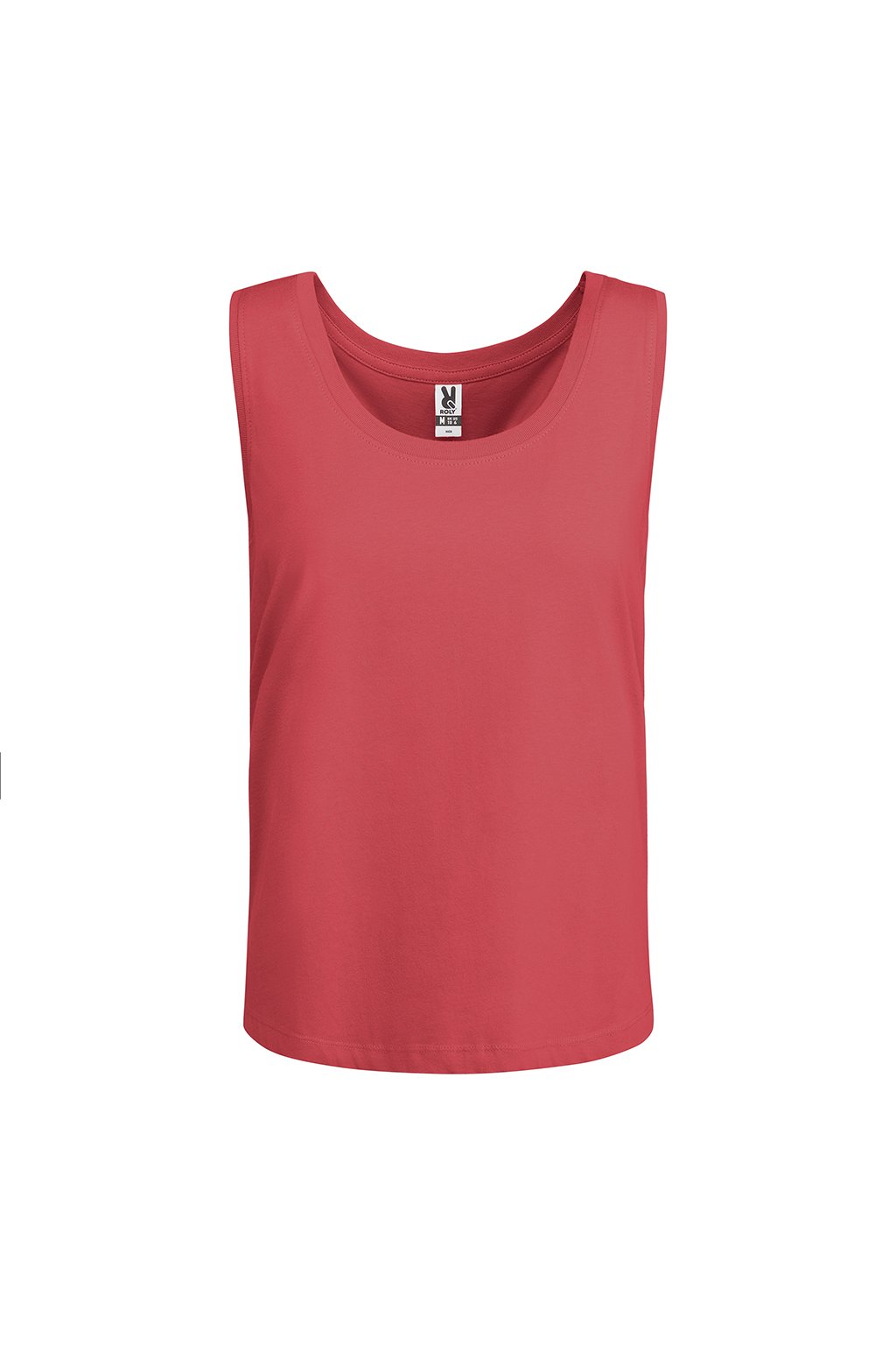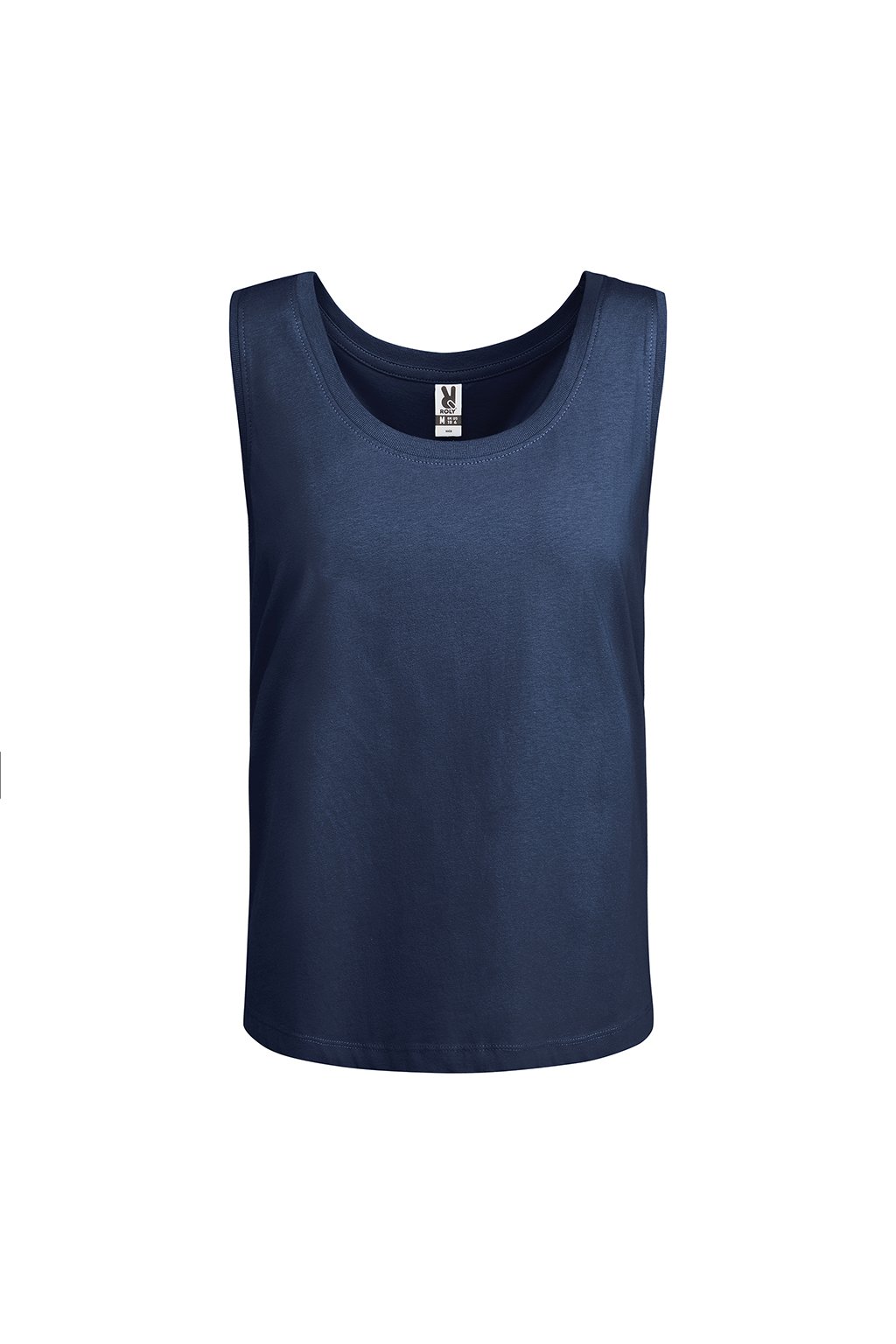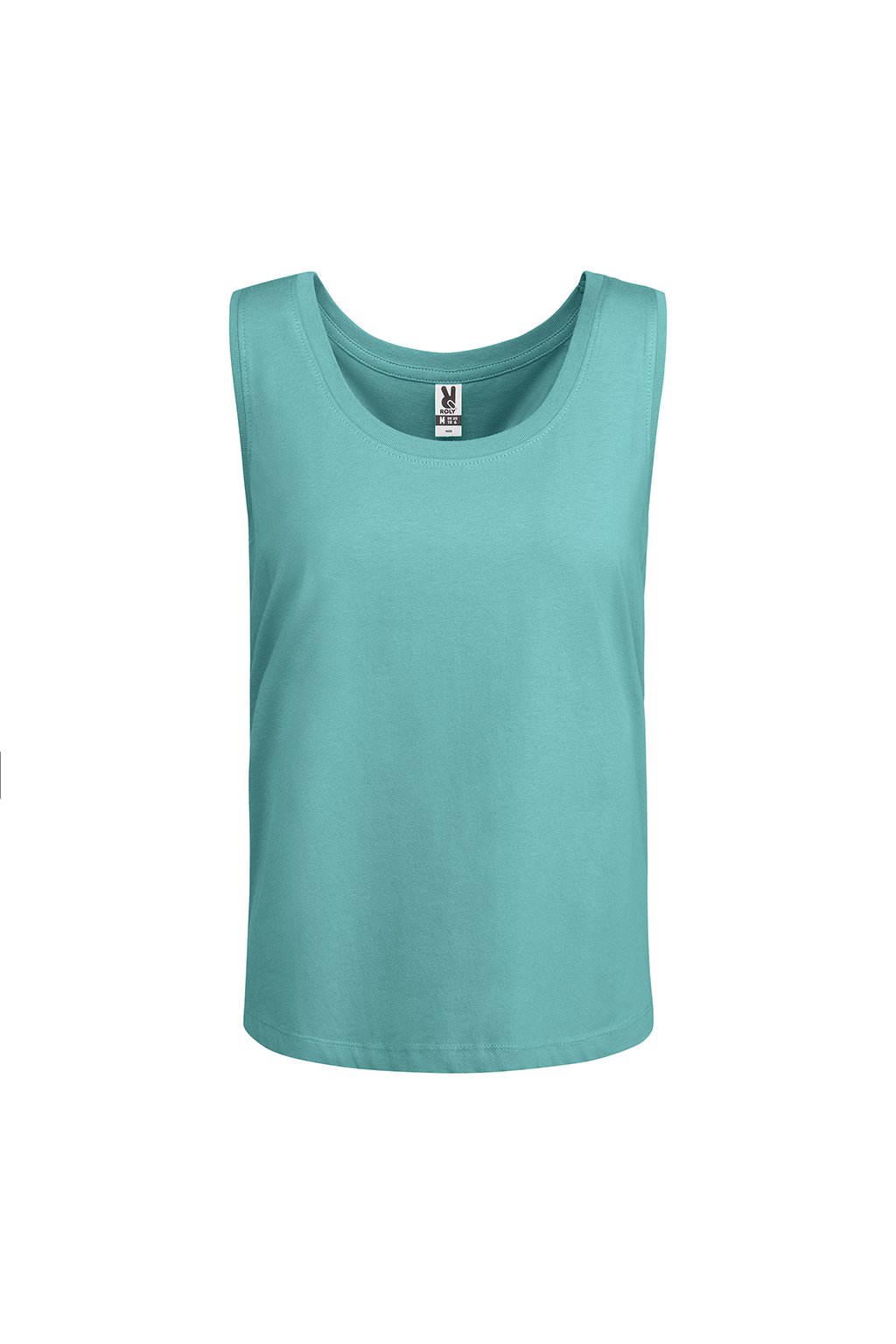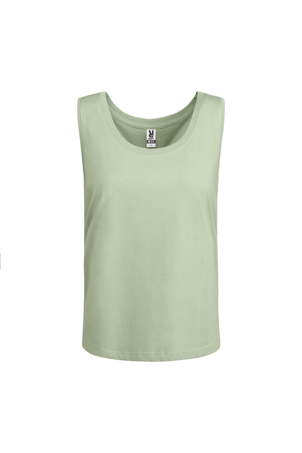 Volné dámské tílko se širokými ramínky. 1x1 žebrovaný výstřih a průramky. Oblý tvar spodního lemu. Boční švy. Barva 58 (melange) - složení 85% bavlna/15% polyester