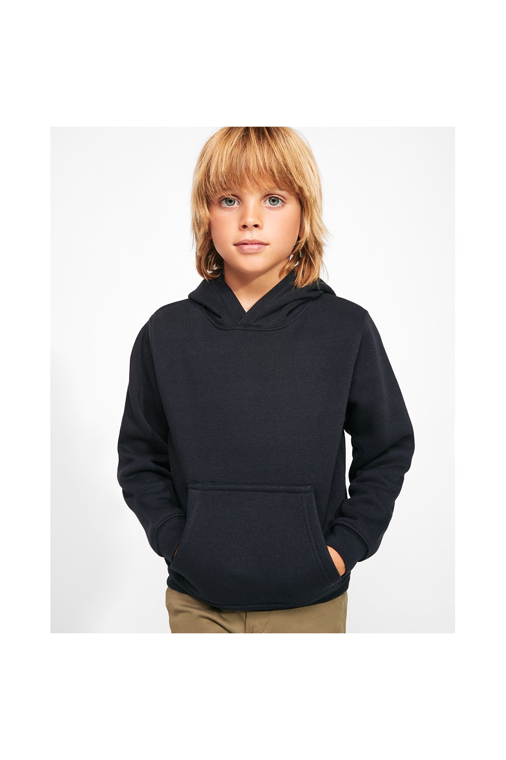 Dětská mikina s kapucí ve 2 různých provedeních- jednobarevná i 2barevná varianta. Klokaní kapsa. Vnitřní barva kapuce a šňůrky v kontrastní barvě u dvoubarevné varianty. Lemování na klokaní kapse. Manžety rukávů a spodní patent v žebrovaném úpletu 1x1.Dětské mikiny jsou z bezpečnostních důvodů dodávaný bez šňůrek.