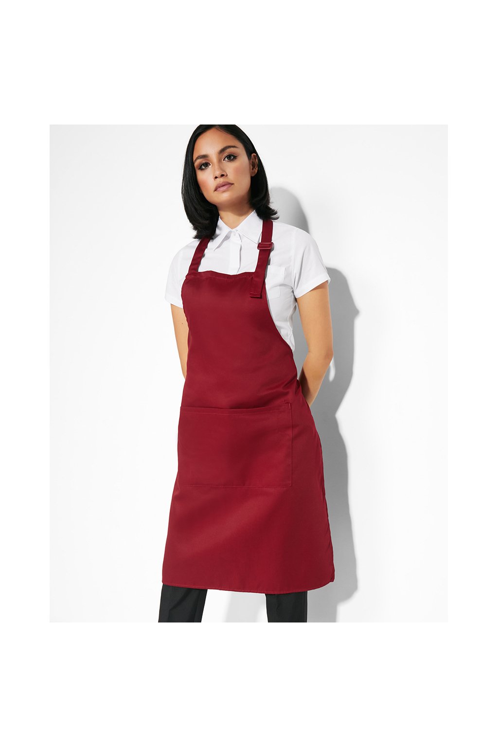 Dlouhá zástěra na vaření s přední kapsou. Délka laclu upravitelná s plastovým uzávěrem. V pase stahovací pásek.