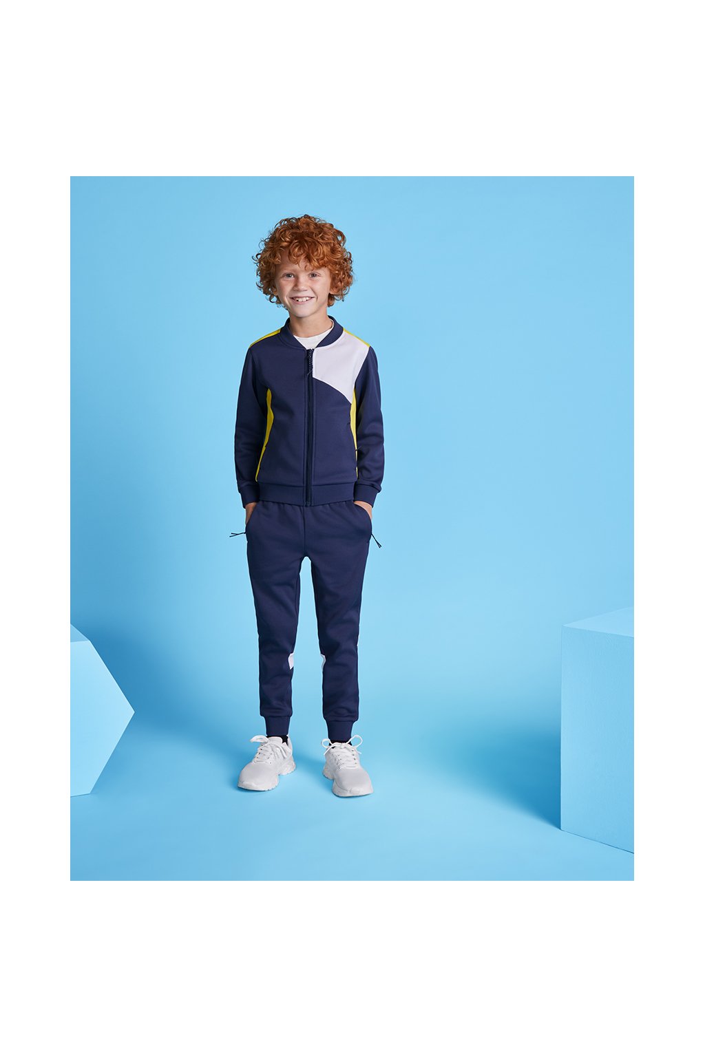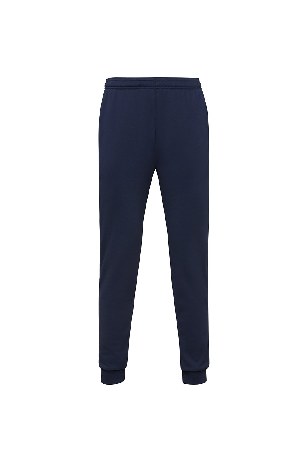 Sportovní kalhoty s elastickým pasem a nastavitelnou šňůrkou. Boční kapsy se zapínáním na zip. Kontrastní pruhy v bílé barvě. Lem s 1x1 žebrovanou manžetou. Lze kombinovat s bundou LEROS.