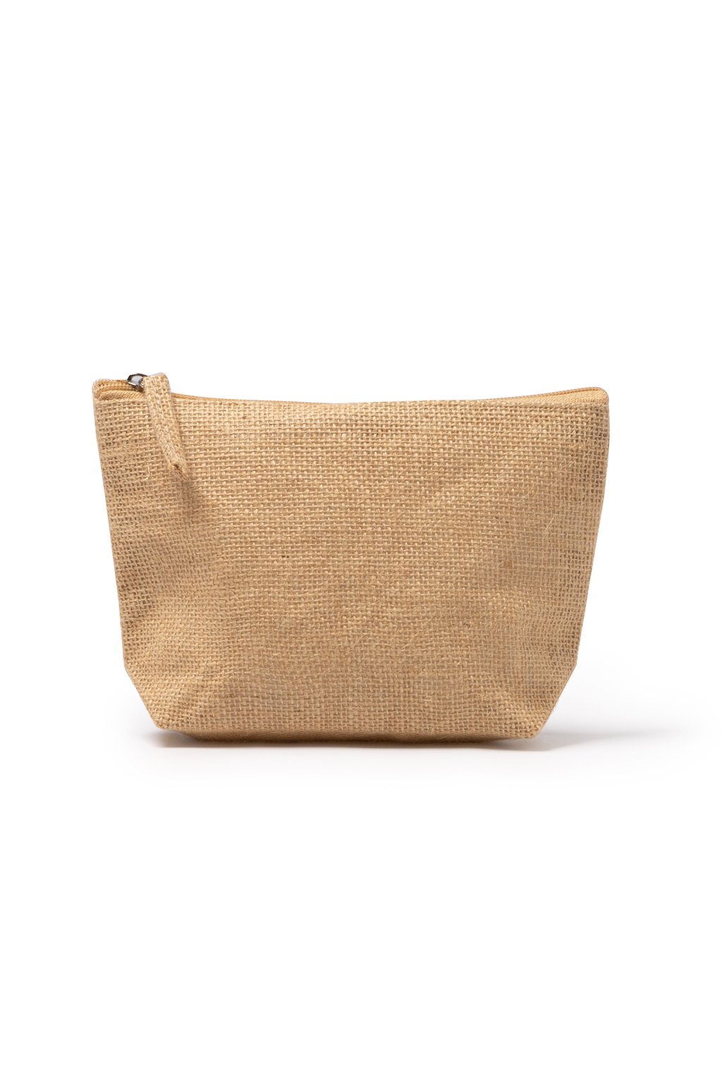 Toaletní taška z přírodní juty s odpovídajícím zipem a jutovým taháčkem.