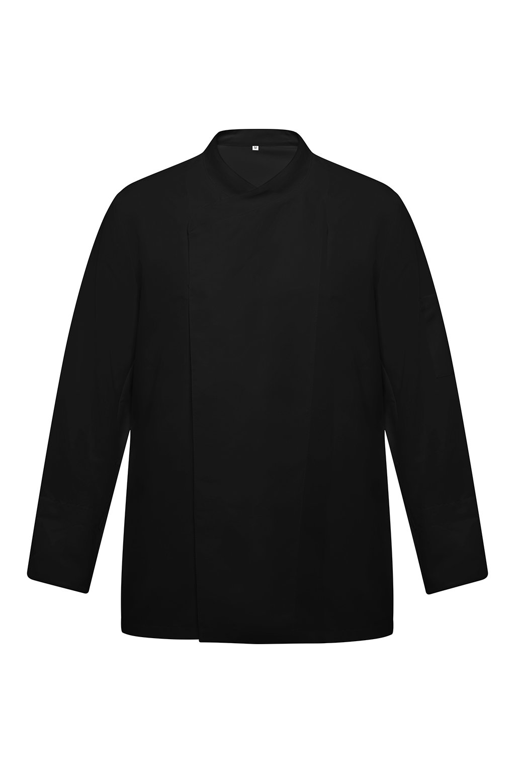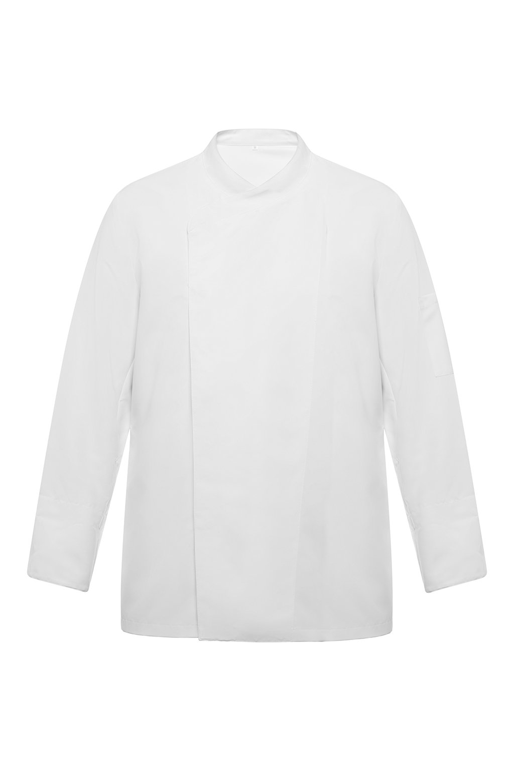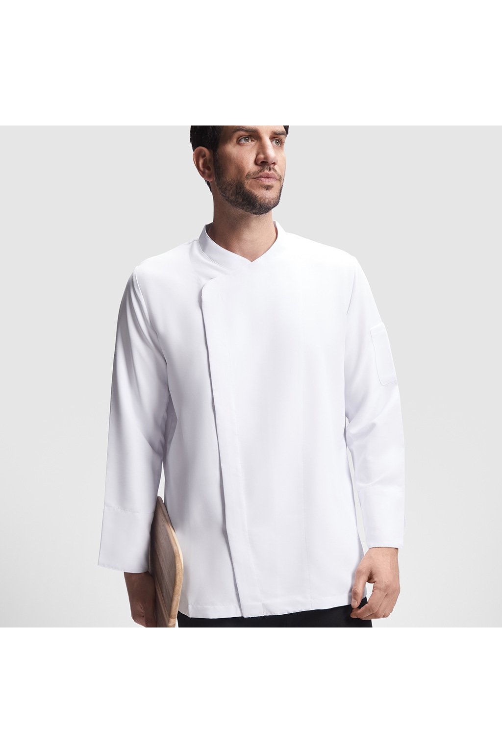 Kuchařský rondon s dlouhým rukávem, překříženým skrytým předním zapínáním na druky, mandarínovým límce a rukávy s ohrnutými manžetami. Rondon má zadní díl z prodyšné látky a pasu na levém rukávu.