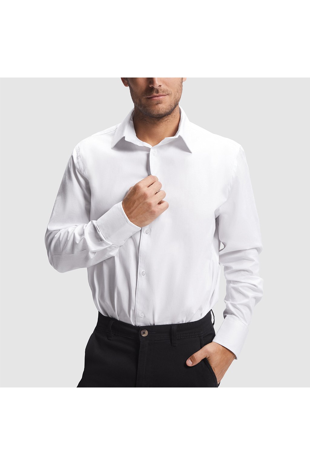 Vysoce kvalitní pánská košile ze stretchového materiálu s dlouhým rukávem.Klasický stojatý límec s knoflíčkem. Zapínaní na sedm knoflíků v barvě košile. Manžety rukávů se dvěma knofličky, tvarovaný dolní okraj. Jedoduchá údržba.
