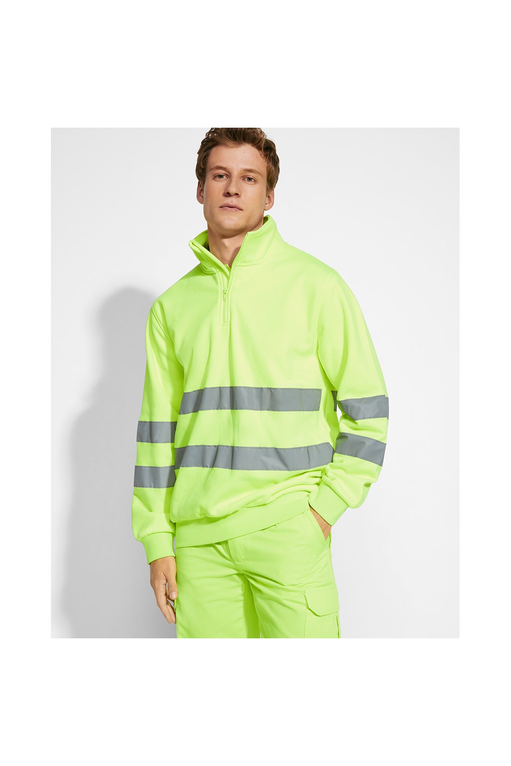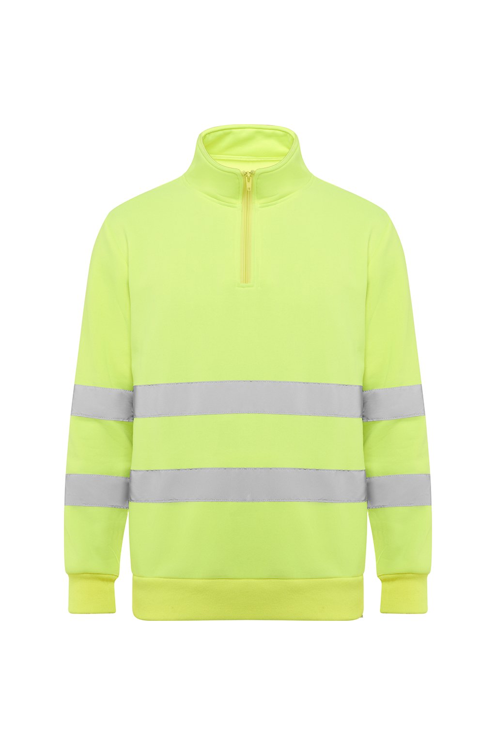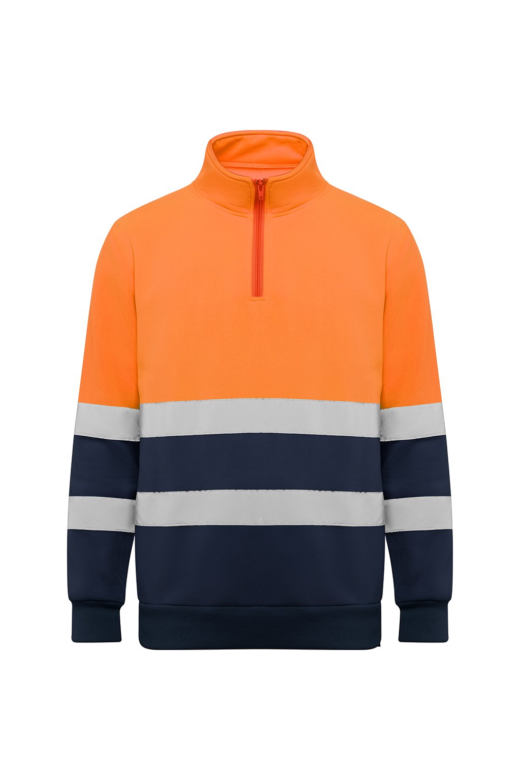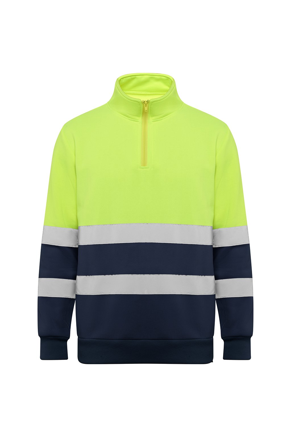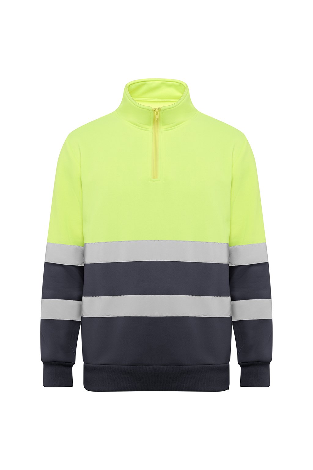 Pánská reflexní mikina s polovičním zipem, vysokým límcem, chráničem brady a zesíleným prošitím na vnitřním límci. Mikina má vodorovné reflexní pruhy na hrudí a na rukávech, 1x1 žebrovanou látku na manžetách a lemu. Certifikace CE podle norem: UNE-EN ISO 13688:2013/A1:2021 a UNE-EN ISO 20471/2013/A1:2017. Třída II.