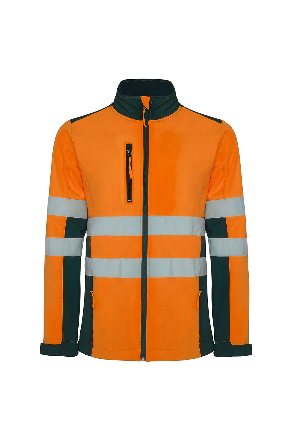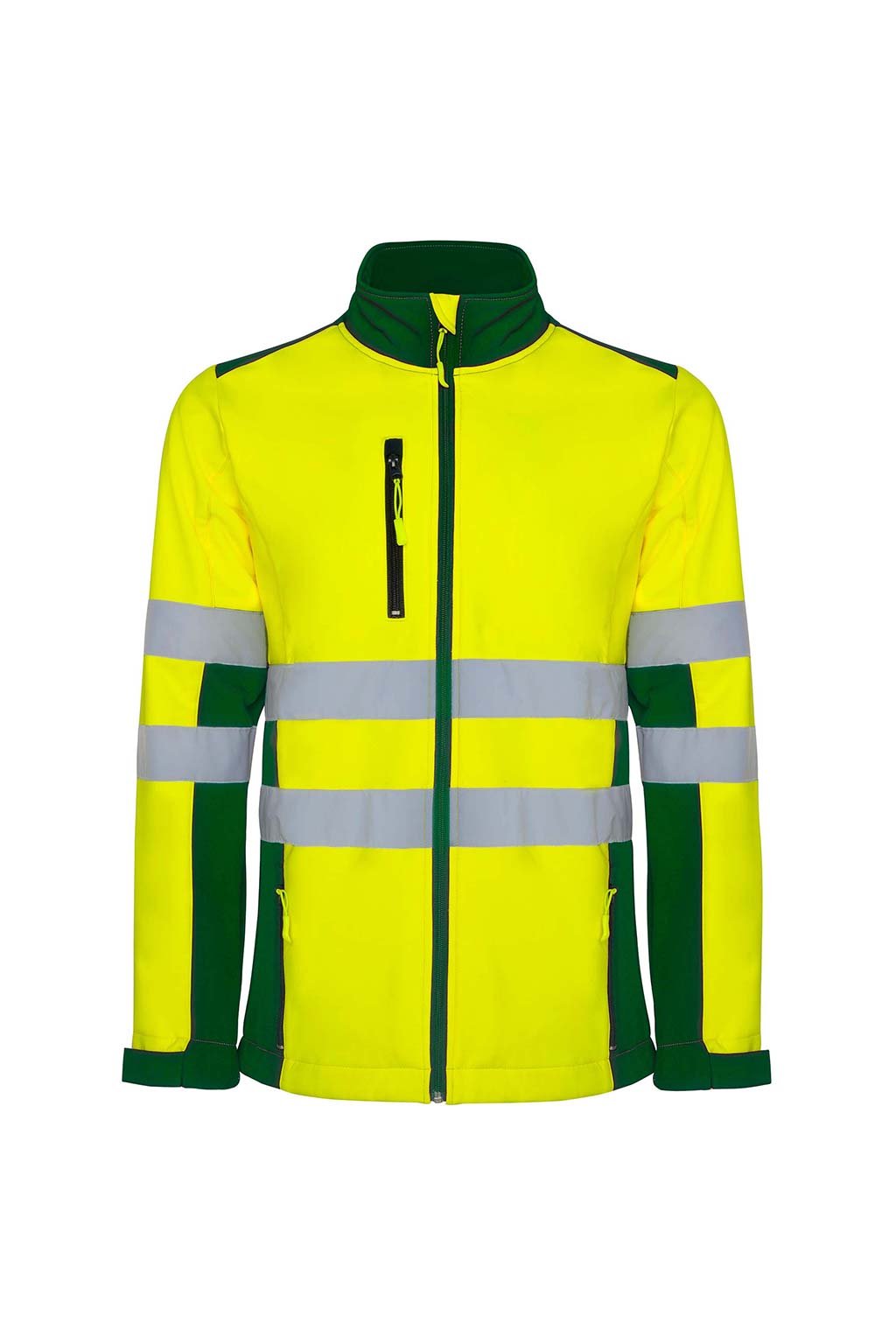 Dvoubarevná reflexní softshellová bunda s vysokou viditelností. Reflexní pruhy kolem těla a na rukávech. Vysoký límec, celopropínací zip. Nastavitelné manžety na suchý zip. V pase šňůrky se zarážkami na stahování. Tři vnější kapsy Vodě a větruodolný materiál.. Certifikace CE podle norem: EN ISO 13688:2013/A1:2021 a UNE-EN ISO 20471:2013/A1:2017. Třída II.