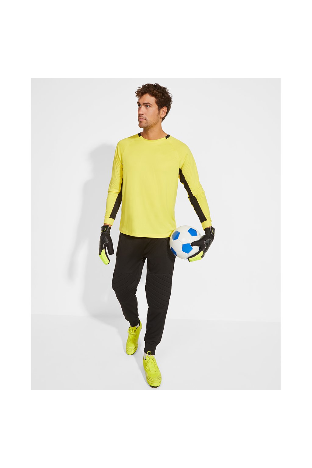 Brankářské kalhoty s prošívanými díly všitými na stranách a prošívanými kolenními nášivkami. Elastický pas s vnitřní stahovací šňůrkou. Spodní lem s manžetou.