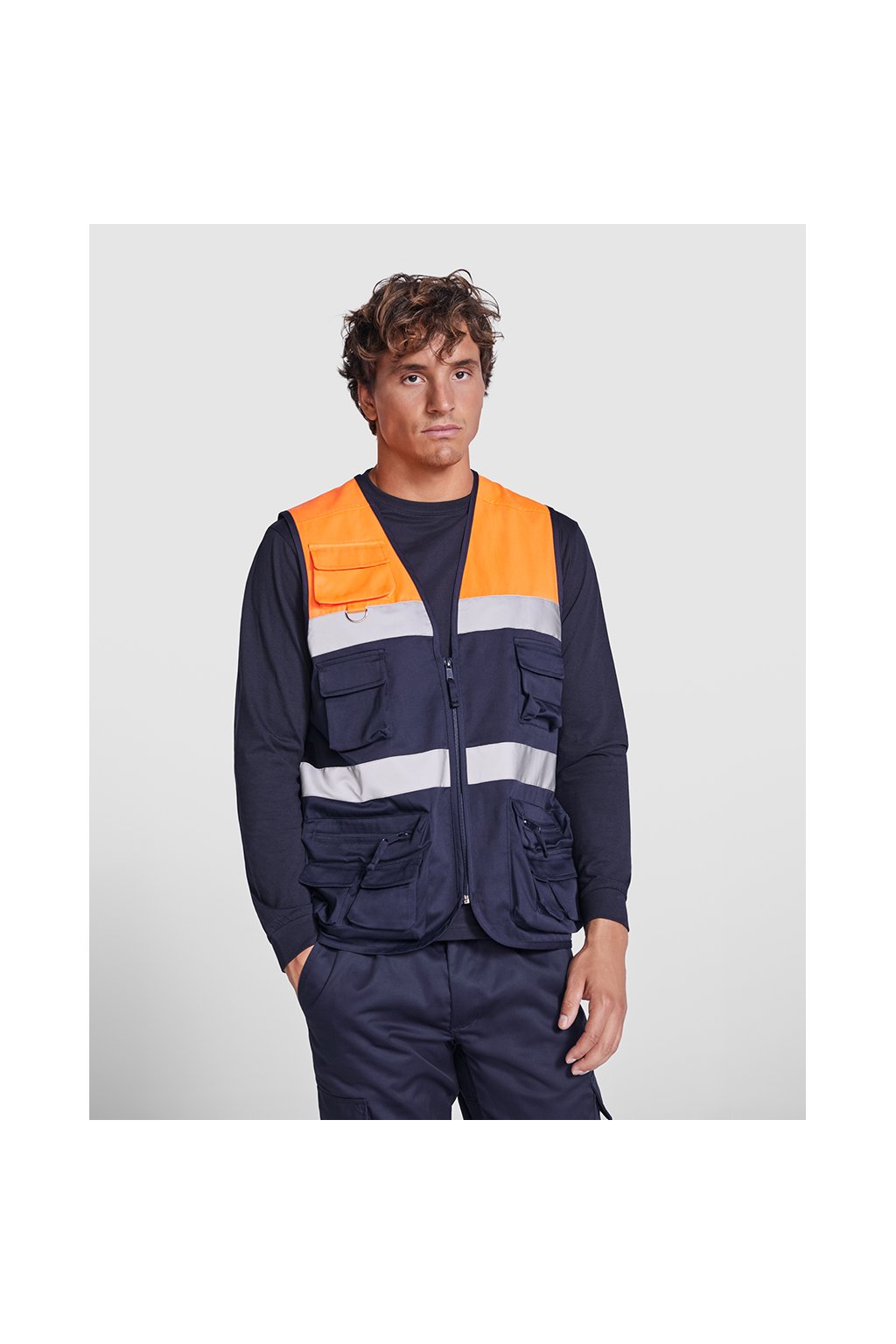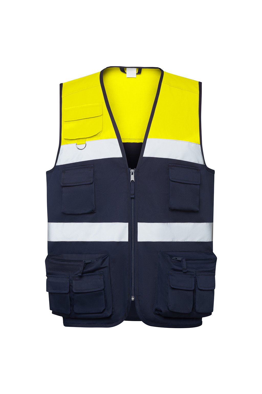 Vesta s více kapsami s vysokou viditelností.· Dva reflexní pásky na hrudi.· Nylonový výstřih do V a zip.· Horní kapsa na pravé straně hrudníku s kovovým kroužkem. · Dvě náprsní kapsy s měchem, klopou a zapínáním na suchý zip. · Dvě boční kapsy s měchem a zapínáním na zip se dvěma překrývajícími se kapsami s klopou a zapínáním na suchý zip. · Dvě zadní reflexní stuhy v pase a na zádech. · Dvě kapsy na zádech s klopou a zapínáním na suchý zip.· Šikmo střižený model.