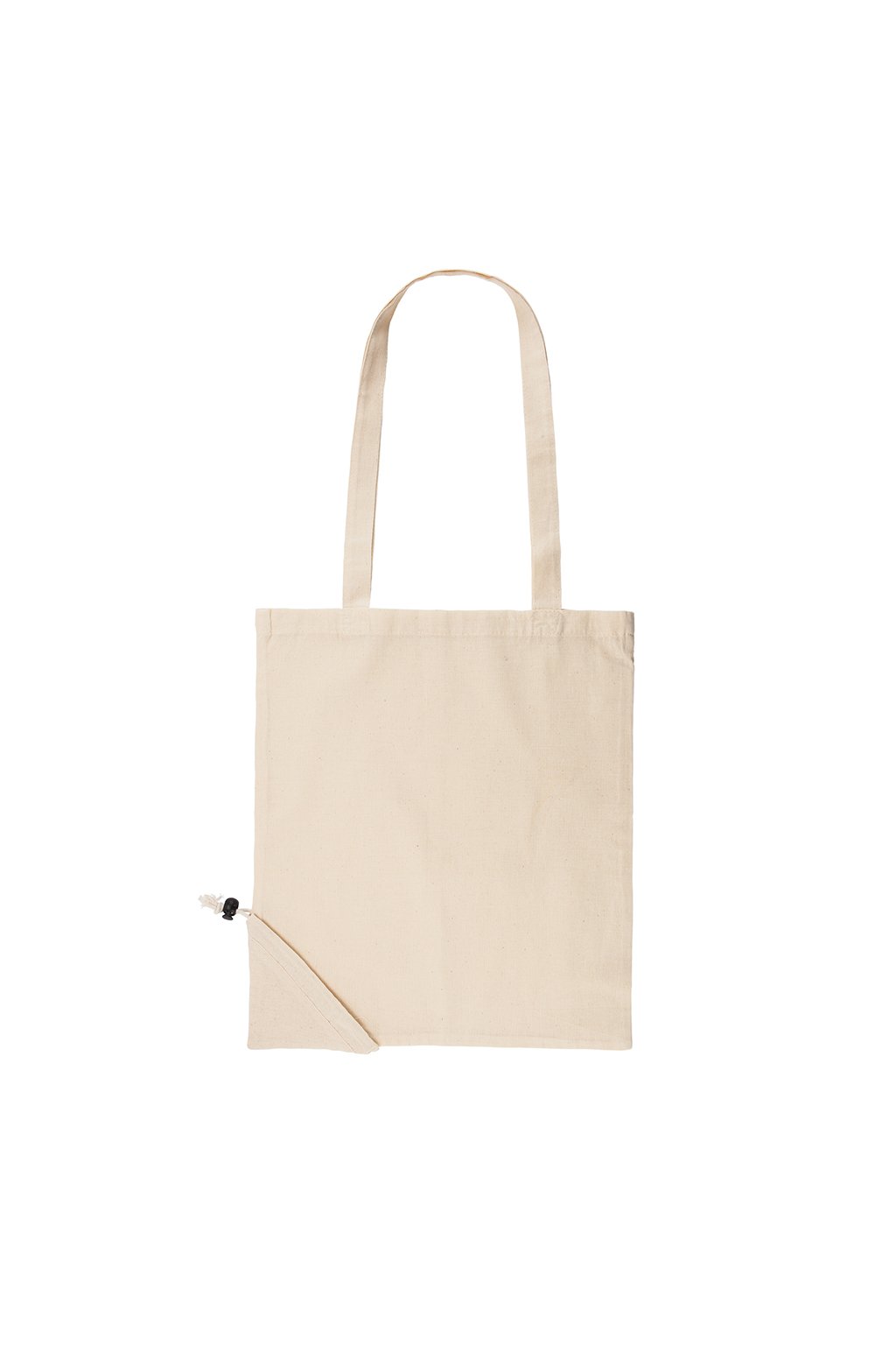 Skládací nákupní taška ze 100% bavlny o gramáži 105 g/m², se 70 cm dlouhými uchy a nastavitelným skládacím pytlíkem se stahovací šňůrkou.