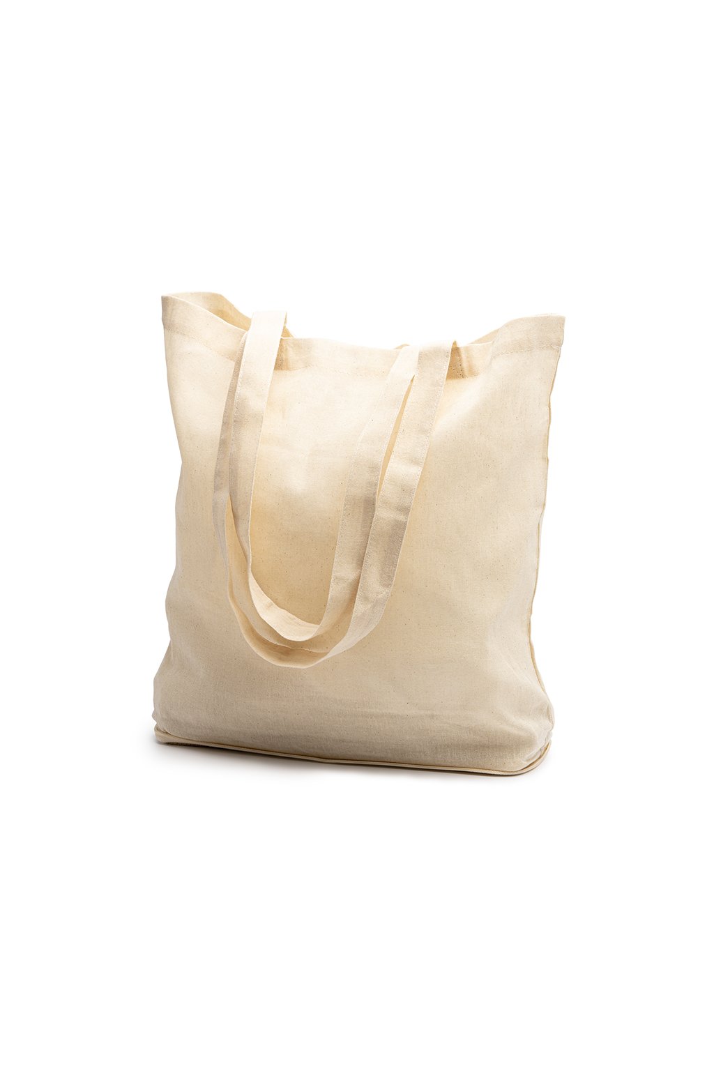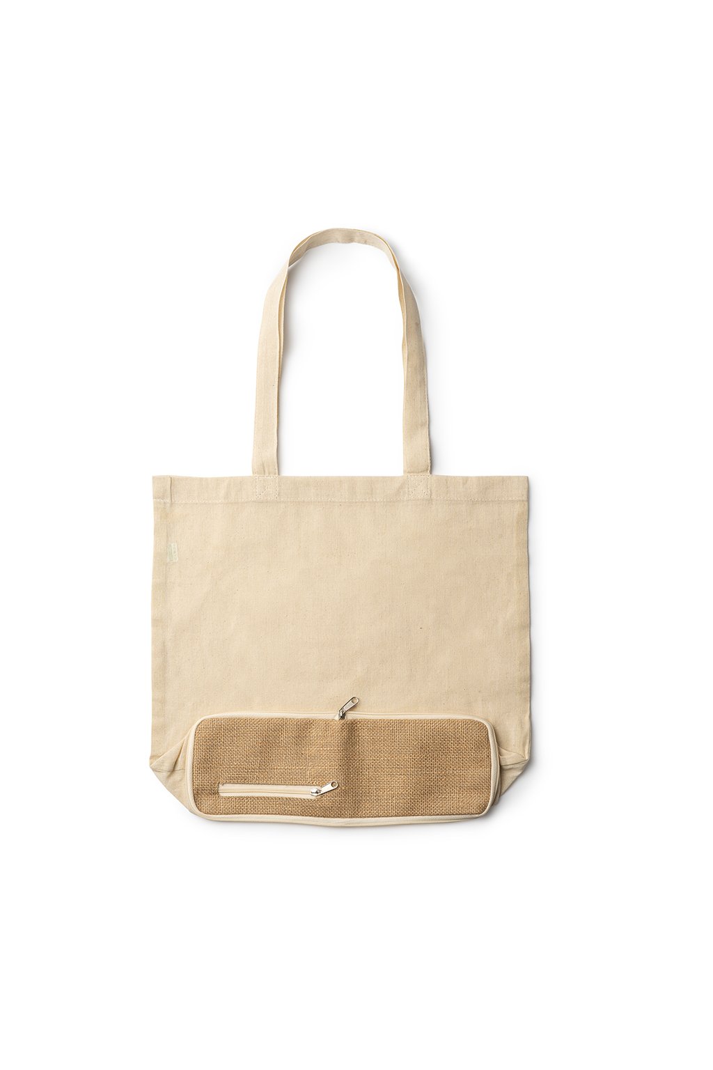 Skládací taška ze 100% bavlny (110 g/m²) se dnem z juty. Součástí je vnější kapsa. Zesílená ucha o délce 60 cm. Snadné skládání a zapínání na zip.