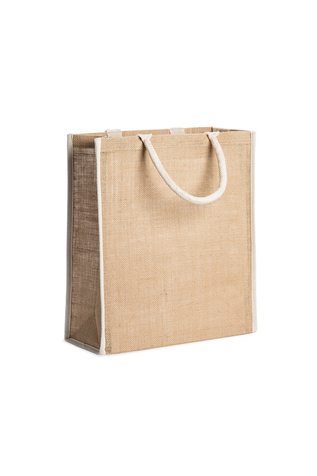 Taška z přírodní juty s lemy a zesílenými bavlněnými uchy. Sešité okraje.